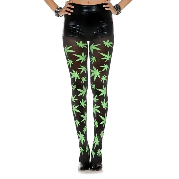 Music Legs Green Leaf Print Opaque Pantyhose
