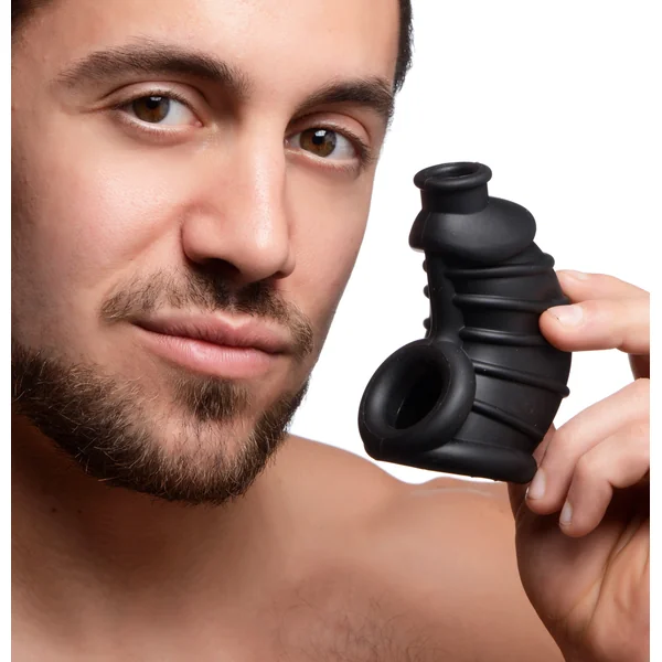 Put His Cock in Silicone Confinement! Wraps your sub’s dick and ball in this Red Chamber Silicone Chastity Cage for
